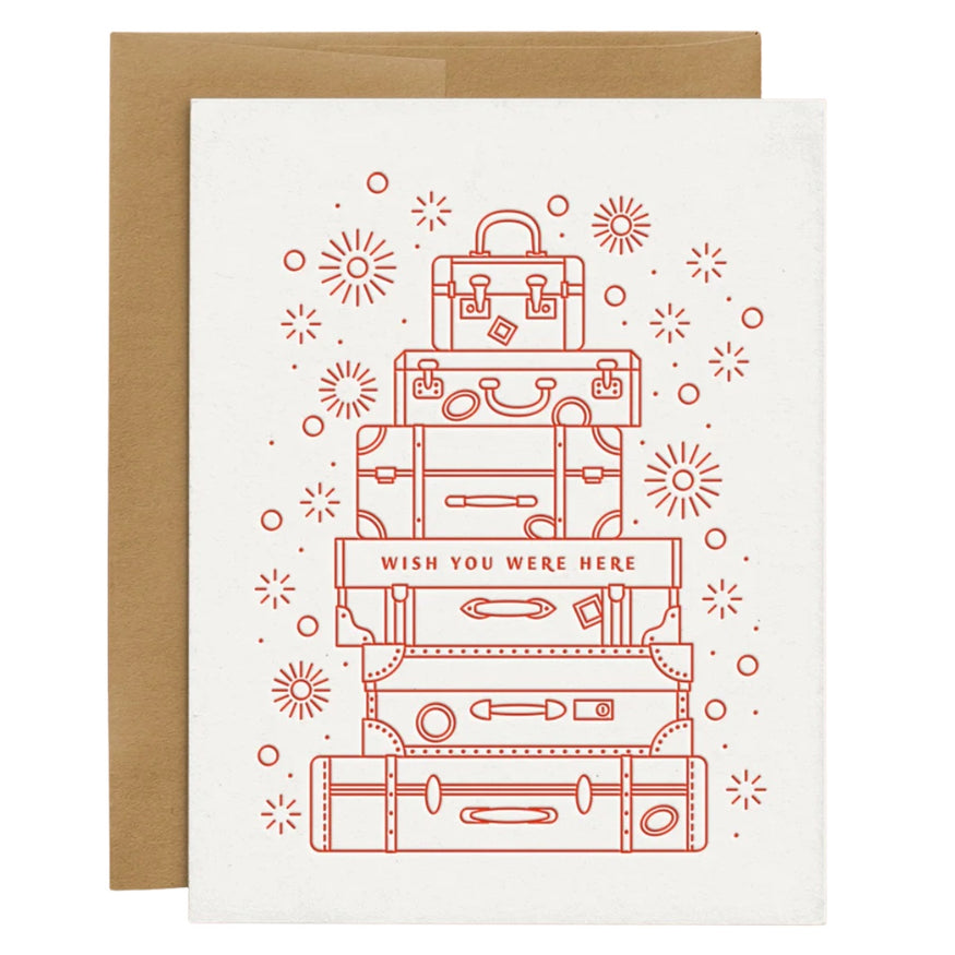 This letterpress card features an original illustration of a tower of suitcases, so you can let someone at home know just how much you miss them on your travels. It’s the next best thing to being there with you!