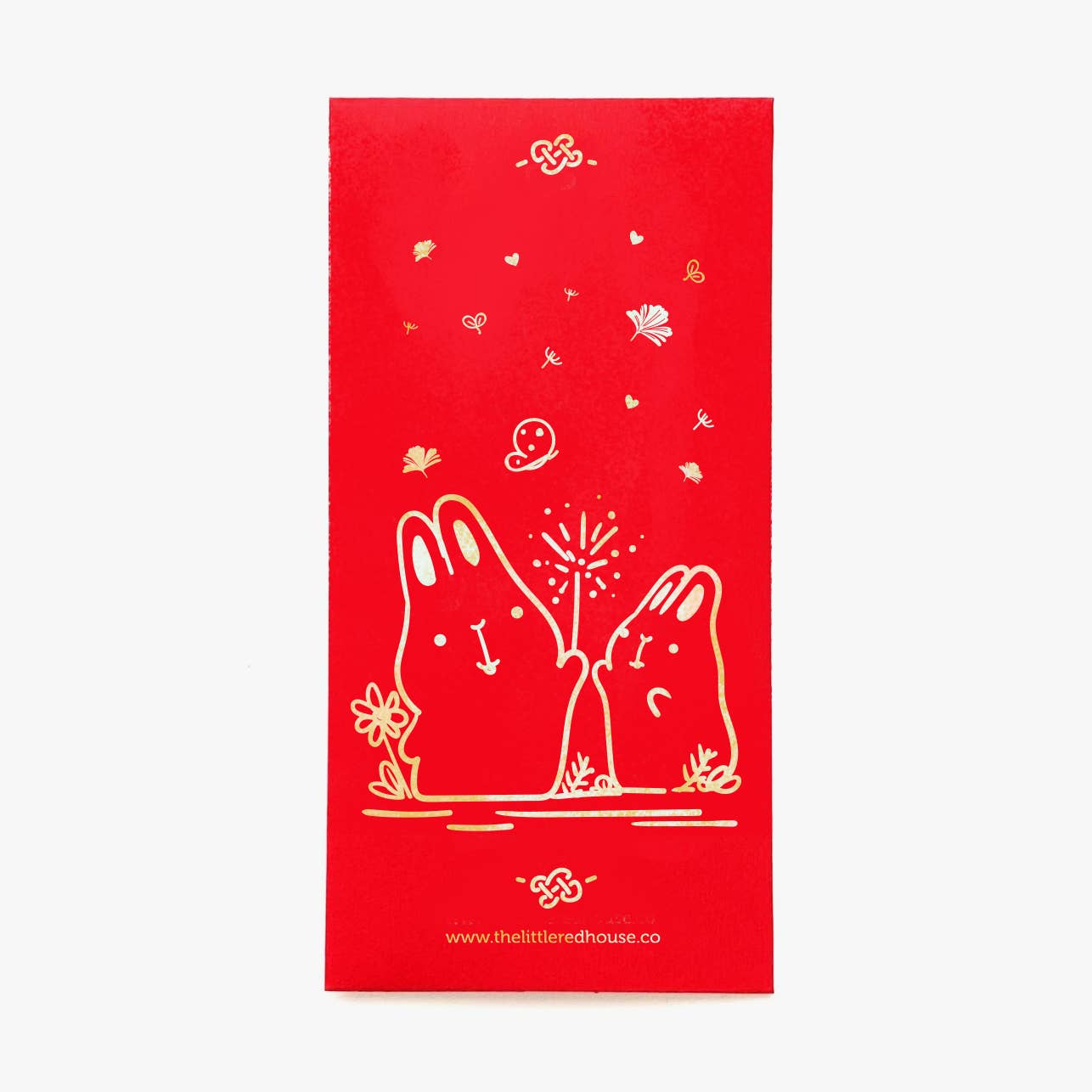 A red pocket envelope for gifting during Chinese New Year or Lunar New Year. Features illustration of two playful rabbits.