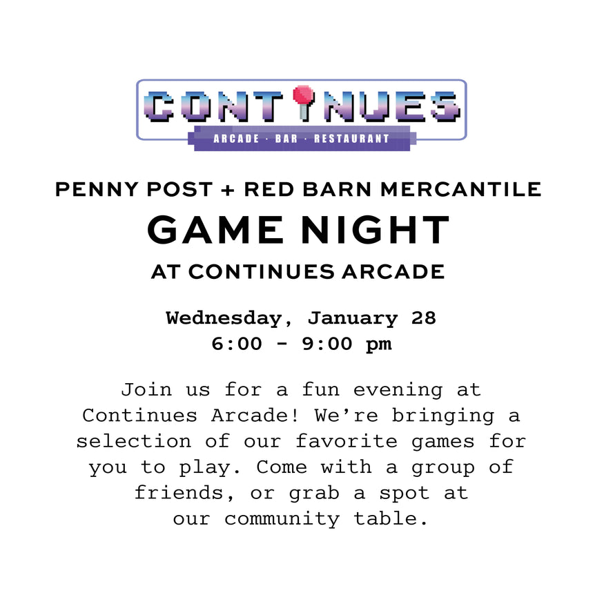 Join Penny Post and Red Barn Mercantile for a fun evening at Continues Arcade! We’re bringing a curated selection of our favorite games for you to play. Come with a group of friends or grab a seat at our community table. Test your trivia knowledge, try your hand at Victorian card games, and explore more of our favorite lightweight party games.