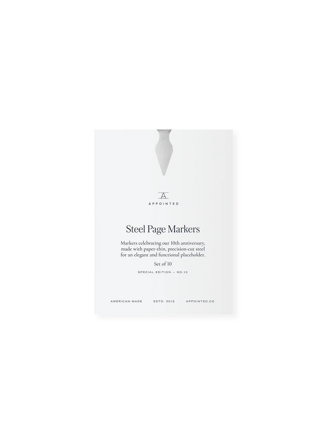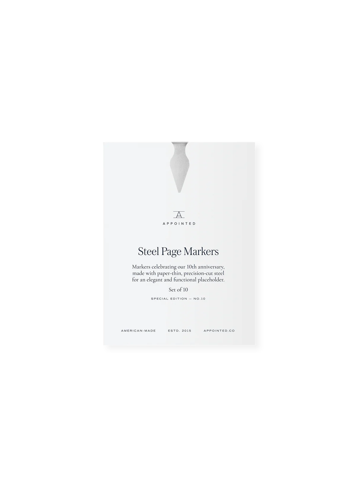 Appointed's special-edition Steel Page Markers, designed to commemorate their 10th Anniversary with traditional hues of silver and blue.