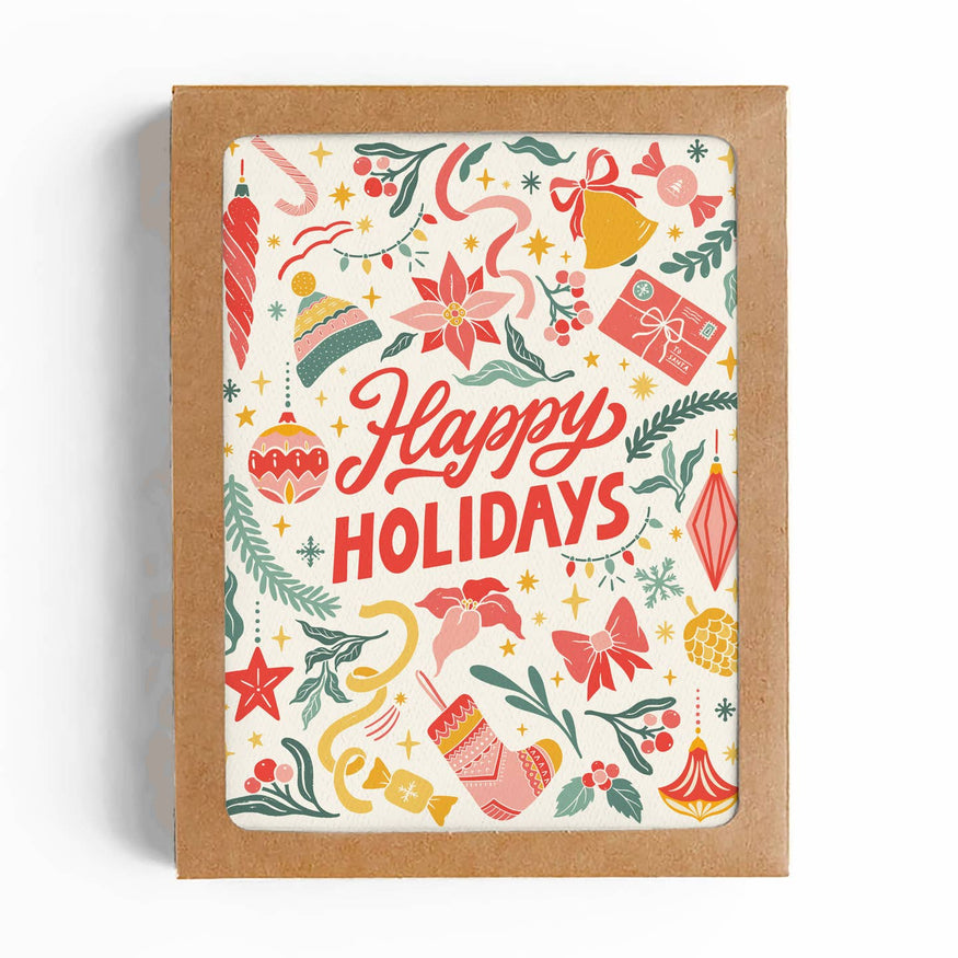 A Happy Holidays card with retro inspired Christmas decor, ornaments and winter greens.
