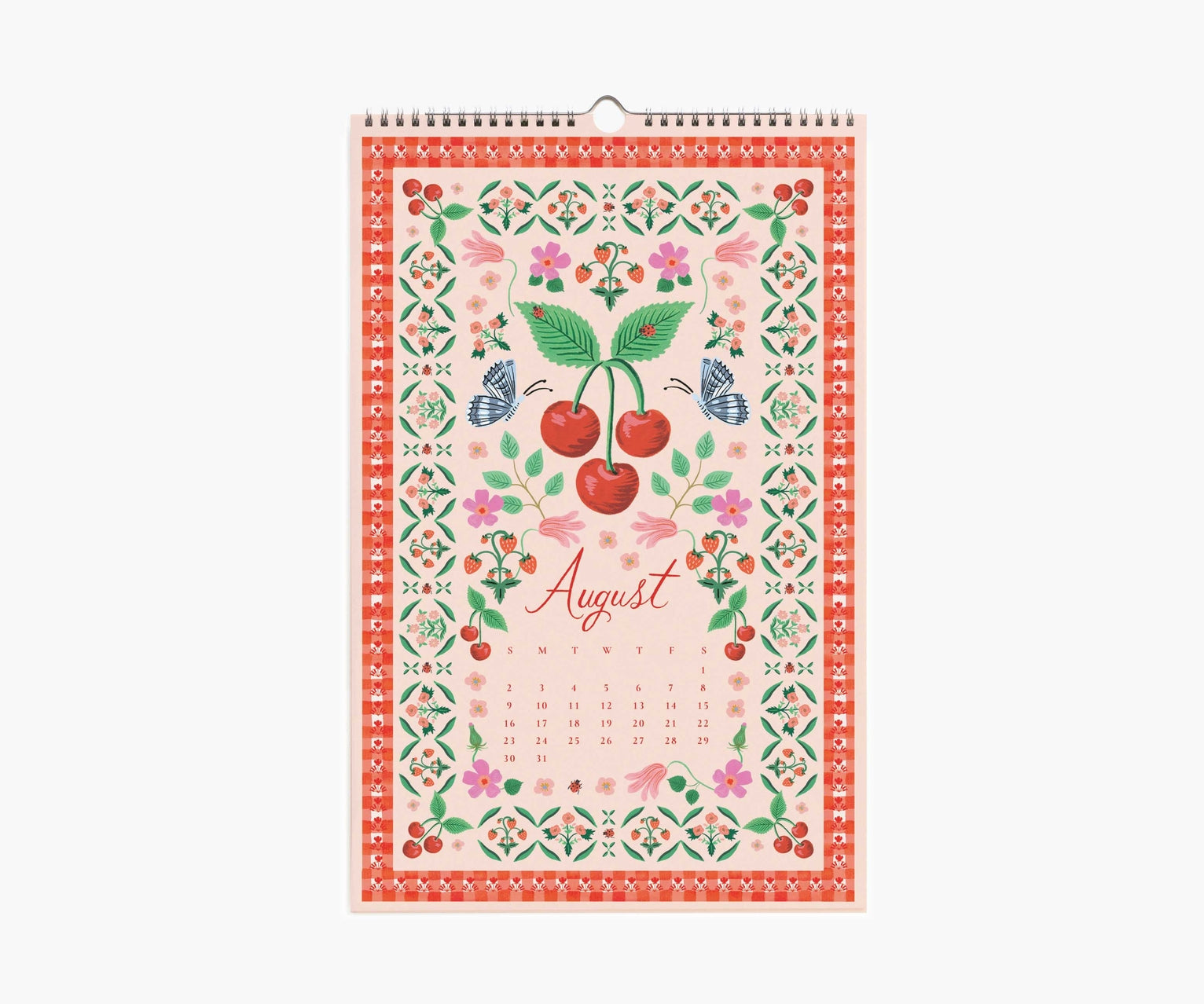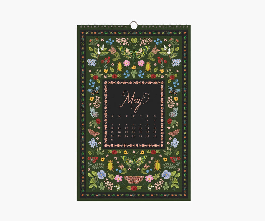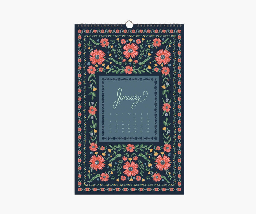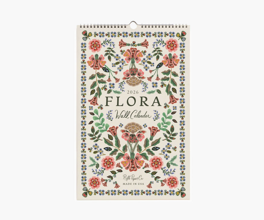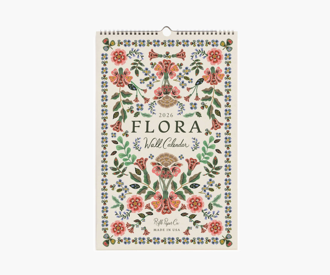 The 2026 Flora calendar includes 12 months of lush illustrations, based on Rifle's new Gracie floral pattern, finished with a spiral binding and center notch for simple hanging.