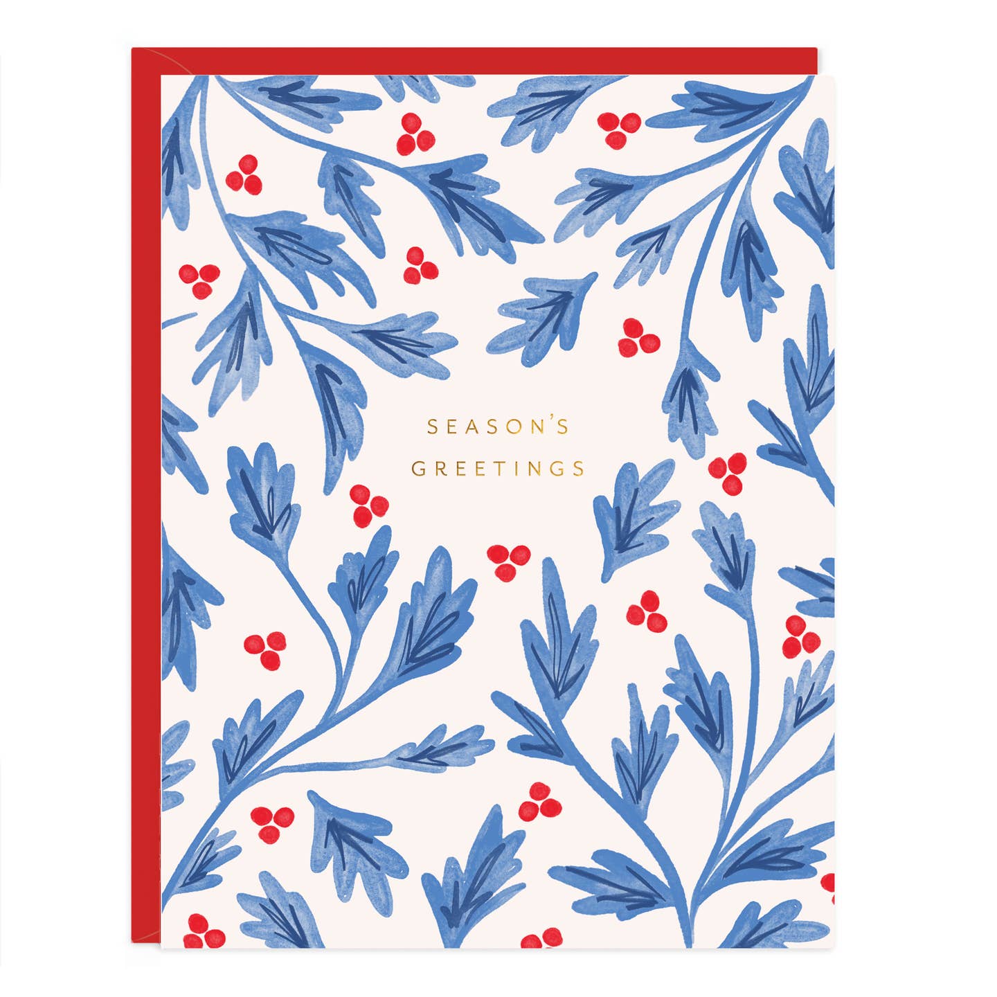 Send your warmest holiday wishes with a lovely blue holly design complete with red berries and a gold foil "Season's Greetings" message.