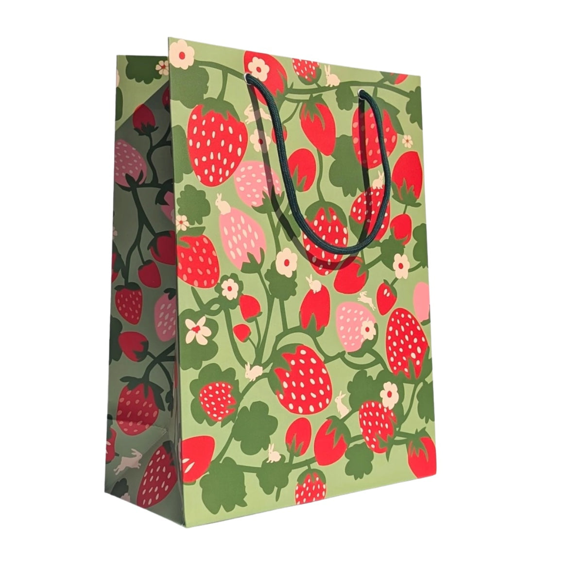 This bag is constructed using heavyweight card stock and printed in full color with patterns that go around all sides of the bag. The base is reinforced with an additional piece of glued-in cardboard to add strength and stability.